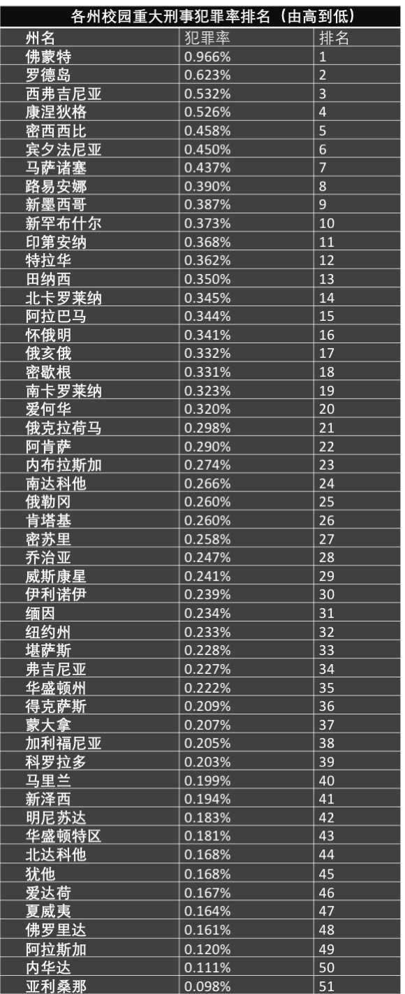 相比之下,校园犯罪率最低的州是位于美国西南部的亚利桑那州。