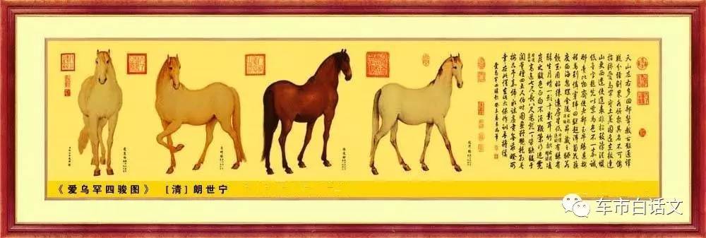 四骏是乾隆年间阿富汗的汗王向清王朝赠送的四匹纯种阿拉伯马。阿拉伯马比《十骏图》中的蒙古马高大威猛,乾隆对四骏爱不释手,给他们取名为超耳骢、月骨騋、徕远骝、凌昆白。