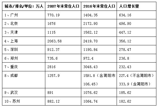 当然,最大的赢家不仅仅是广州。特别值得说的是,内陆的郑州、重庆、成都、武汉,闯入人口争夺排名前10行列。而其余6个,全部是东部发达城市,北上广深就不说了,天津、苏州表现抢眼。