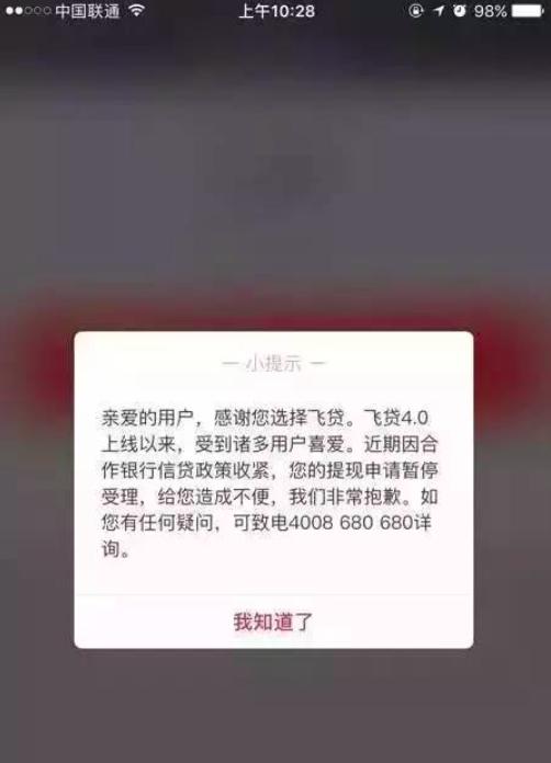 7月18日,有媒体报道,深圳中兴飞贷金融科技有限公司旗下现金贷产品——飞贷出现借款失败的情况,提示原因是合作银行信贷政策收紧。