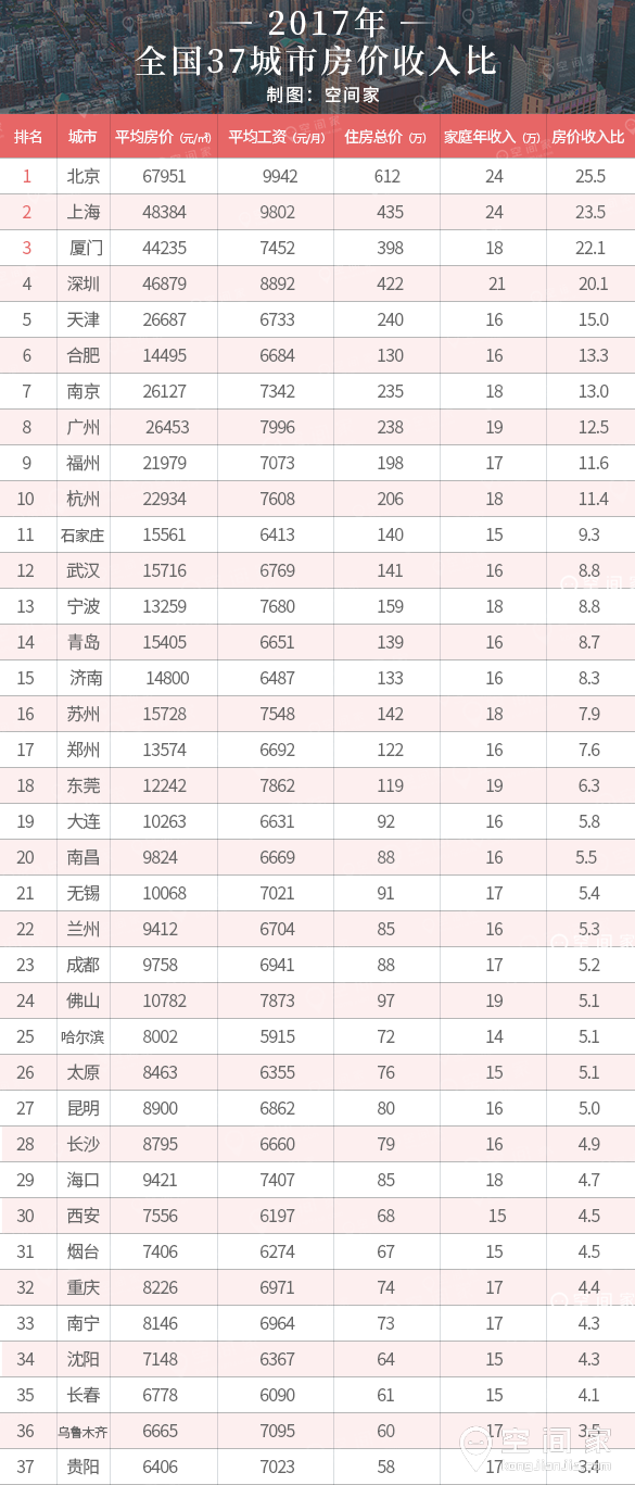 2017年,中央对控制房价采取“雷霆行动”,势必要让房子回归居住属性。上半年,一二线城市新建商品住宅价格同比涨幅连续回落,三线城市稳步攀升。据空间家统计数据显示,2017年全国37个主要城市房价收入比,有49%的城市房价不合理,一线城市房价收入比居高不下。