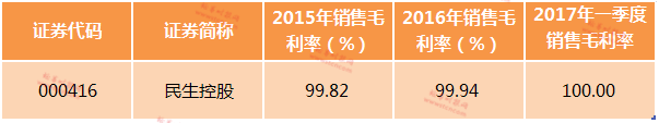 民生控股的经营业务为典当、财富管理、保险经纪,均属于营业成本很少而绝大部分支出计入费用的情况,因此公司的毛利率居榜首也就不足为奇了。事实上,用毛利率这个指标来衡量这类金融服务业上市公司,没有太大的实际意义,判断其盈利能力,还需要从净利率等数据入手。
