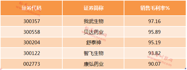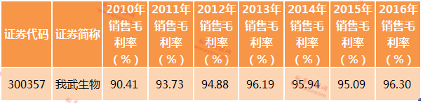我武生物长期占据A股销售毛利率的前三,自2010年起毛利率没有低于过90%,简直就是为暴利而生。