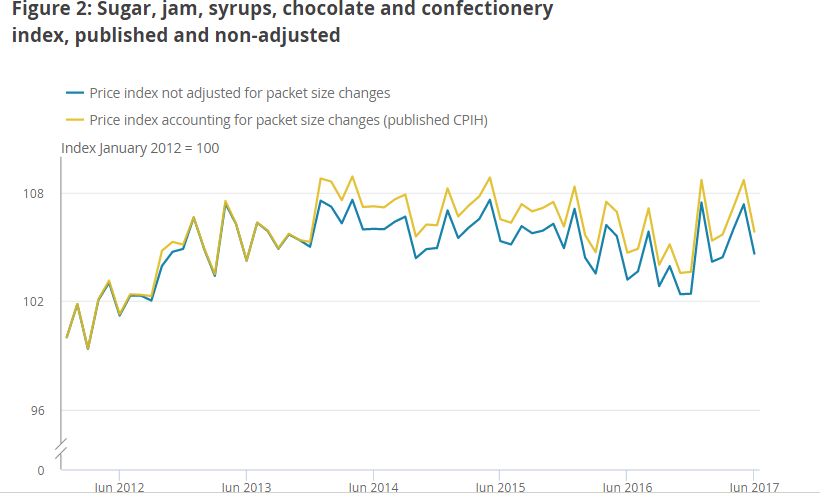 对于分量缩水最严重的糖、果酱、糖浆、巧克力和糕点这一大类商品来说,经质量调整后的通胀比未经质量调整的通胀高出1.2个百分点。