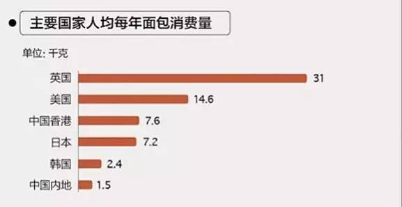 另有一个数据显示:对比国际面包人均消费,中国内地人均每年仅消费1.5kg面包,与美国人均14.6kg以及英国人均31kg的面包消费量相去甚远。这是否说明中国面包人均消费还有更大空间?
