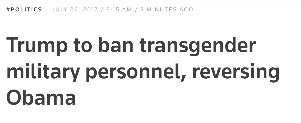 【特朗普禁止变性人服役】特朗普周三发表讲话说,将禁止变性人在美军服役。这推翻了奥巴马过去多年致力于消除基于性别和性取向的服役障碍的努力。