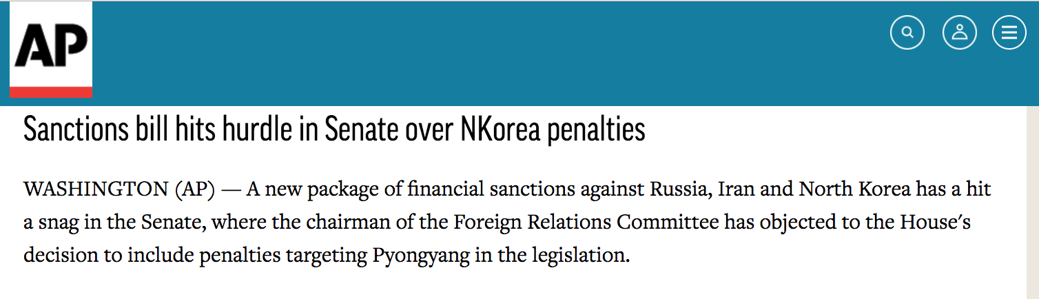 【美对三国制裁方案或因朝鲜问题受阻】美国参议院一项关于针对俄罗斯、伊朗、朝鲜实施经济制裁的方案受阻。外交委员会主席反对将朝鲜纳入制裁范围。