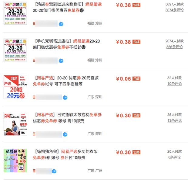 根据教程,我们在淘宝上搜索“网易严选 免单券”,果然看到了近期在朋友圈出现的各种爆款:暗格简约钢笔、 四季拖鞋、太古抱枕、马克杯、丝瓜络等,都有对应的免单券。说是免单券,其实购买的是拥有这些券的账号。这些账号非常便宜,通常只要几毛钱,这两天刚出现的钢笔免单券则要贵一些,多为 1.5-2 元,应该是与商品本身价格较高有关。