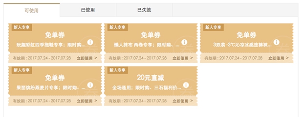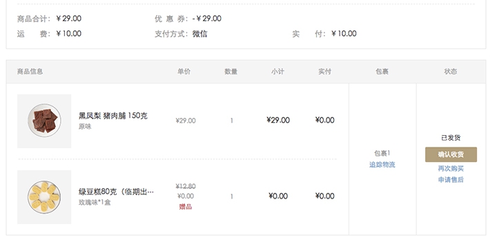 爱范儿尝试购买了一张 20-20 的无门槛优惠券以及一份猪肉脯免单券,卖家在旺旺上给了我们 2 个新手账号,登陆进去果然可以看到对应的优惠券,并且我们也可以顺利下单。