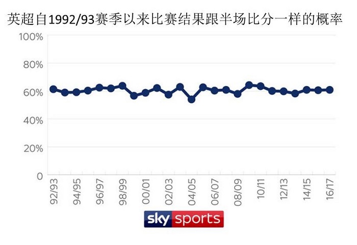 但事实上,在我们研究的9746个英超赛果样本中,有5878场赛果跟半场比分一样。借此,我们得出全场比分跟半场比分一样的概率为60%。