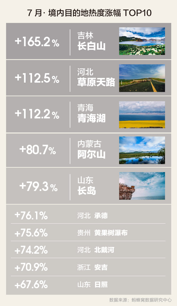 与6月份相比,境内热度涨幅最大的是避暑圣地和海边。涨幅排在前十的目的地分别是长白山、草原天路、青海湖、阿尔山、长岛、承德、黄果树瀑布、北戴河、安吉和日照。其中,涨幅最大的是长白山,7月热度与6月相比增长高达165.2%。