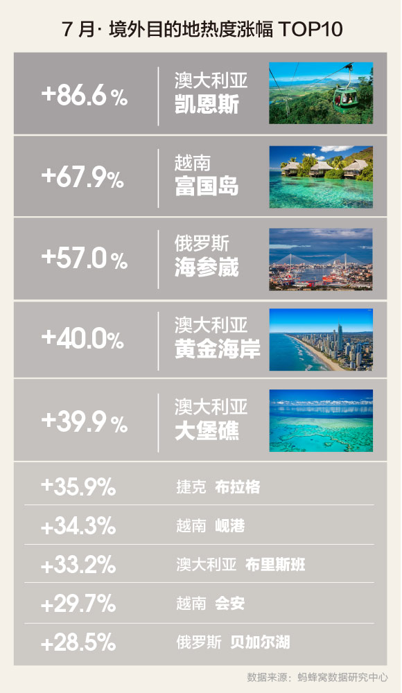 与6月相比,热度变化幅度最大的目的地分别来自澳大利亚、越南、俄罗斯和捷克等4个国家。其中,位于澳大利亚北部的凯恩斯,7月热度与6月相比增长86.6%。澳大利亚北部离赤道较近,5-10月正值旱季,也是当地的最佳旅行时间,降水不多,天气也不会过于炎热,非常适合徒步或者浮潜等户外活动。