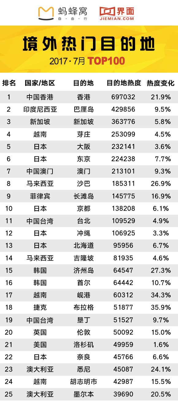 境外旅游目的地100强中,排在前十的目的地分别中国香港、巴厘岛、新加坡、芽庄、大阪、东京、中国澳门、沙巴、长滩岛和京都。其中日本目的地的热度最高,在前100的目的地中占到20席。地处南半球的澳大利亚此时正值冬季,也被当成避暑圣地而热度高涨。