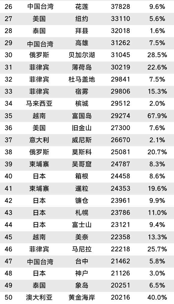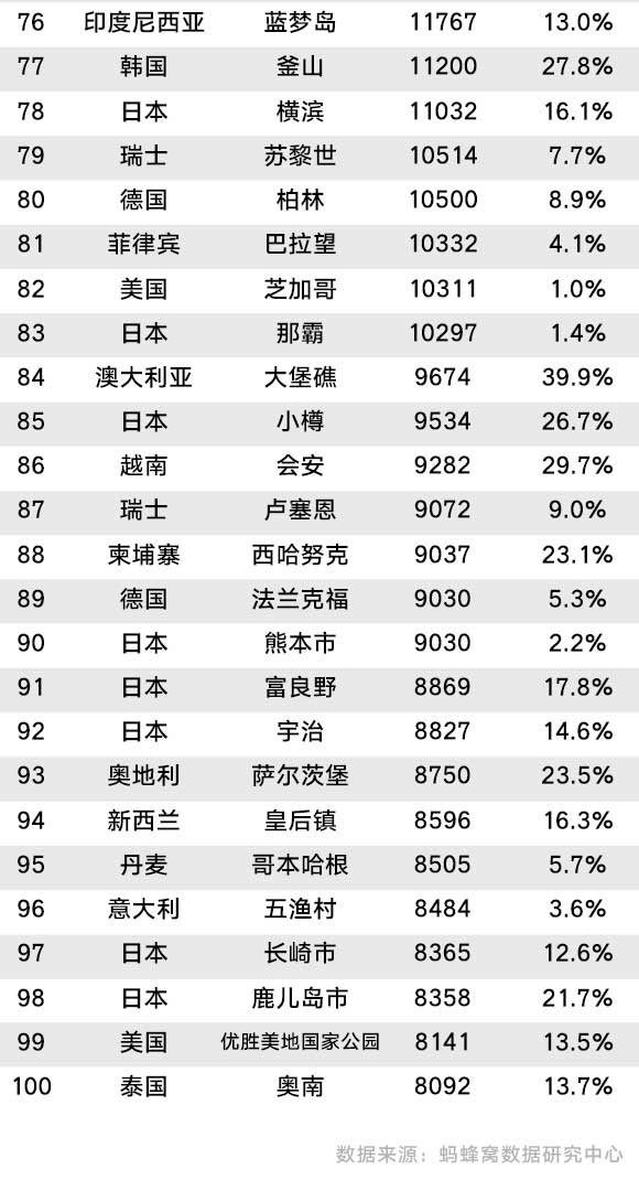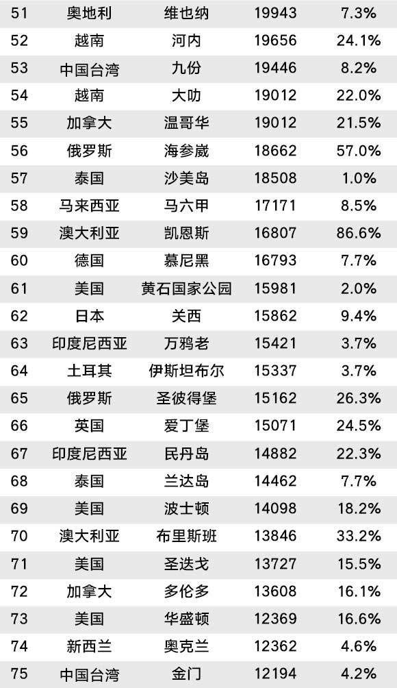 附2017年7月全球热门目的地100强名单: