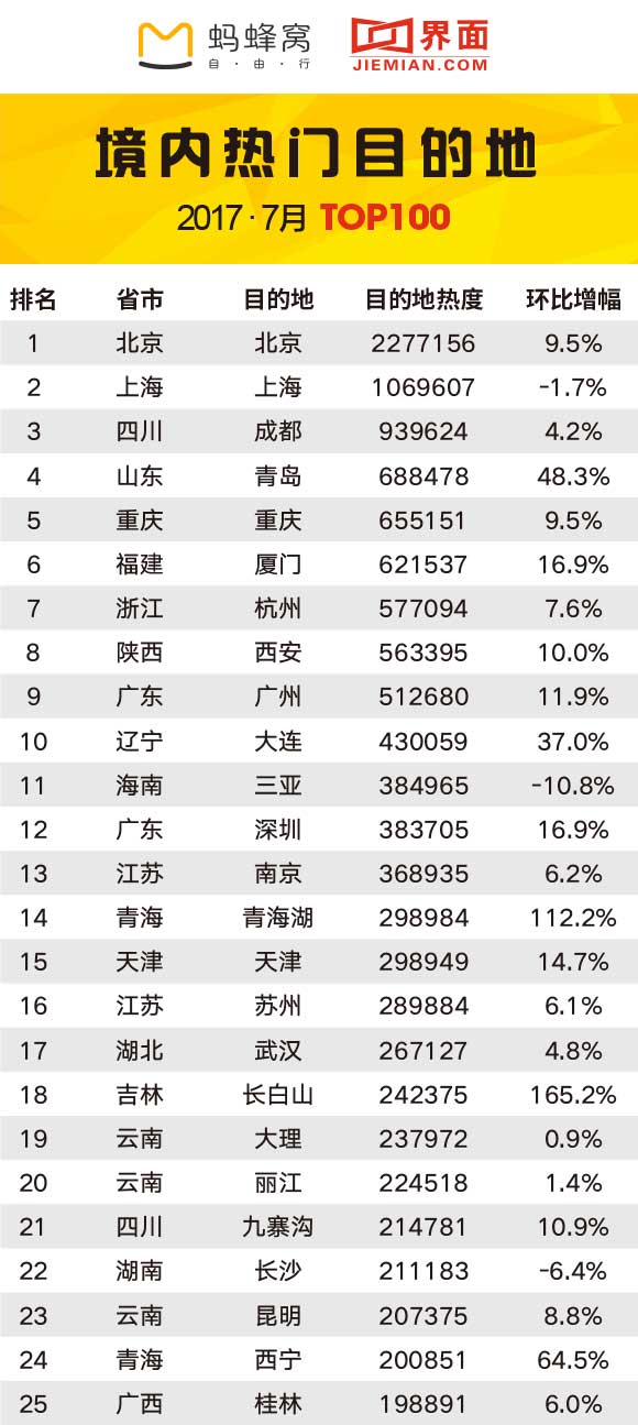 7月迎来暑期游高峰,境内旅游目的地100强中,排在前十的目的地分别是北京、上海、成都、青岛、重庆、厦门、杭州、西安、广州和大连。