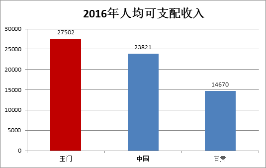 相比GDP而言,人均可支配收入更能反映出当地居民的生活水平。据统计,2016年全国人均可支配收入为23821元,玉门的人均可支配收入则达到了27502.87元,不仅高于全国平均水平,也远远高于甘肃省14670元的水准。