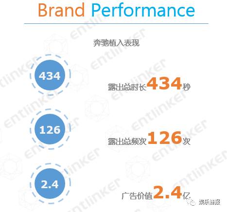 在这22部影片中,奔驰总计露出126次,总时长434秒,如果以品牌和车型可以识别的有效露出时长来计算,其广告价值约为2亿4千万元。