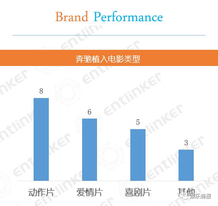 据小编统计,奔驰在22部影视作品中,涉及的电影类型丰富,其中出现最多的是动作片,多达8部。其次是爱情片6部,喜剧片5部,其他类型共3部。