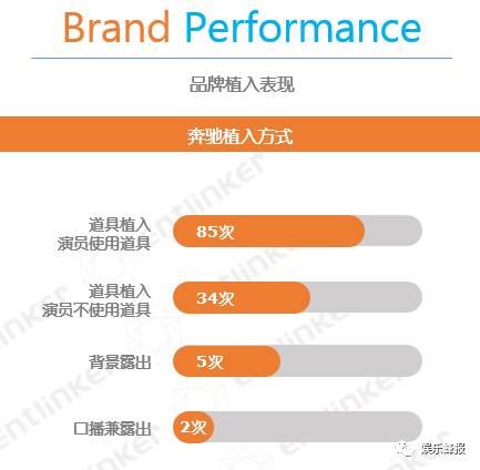 在126次露出中,奔驰大部分时候作为剧中角色使用的道具出现,共85次。