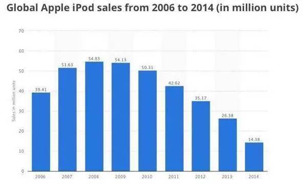 果然,一年之后(2008年),iPod销售额达到顶点,苹果出售了5480万台iPod。然而从2009年开始,iPod销售量就开始逐年下跌,直到2014年10月份,也是苹果披露iPod销量的最后一个季度,仅售出260万台iPod,销售额仅占苹果总收入的1%左右。远低于该季度3930万部iPhone的销售数字。iPhone大热,而没有App Store及一些iCloud、Apple Music的支持,对消费者来说,非触摸iPod已经变得不怎么实用了。