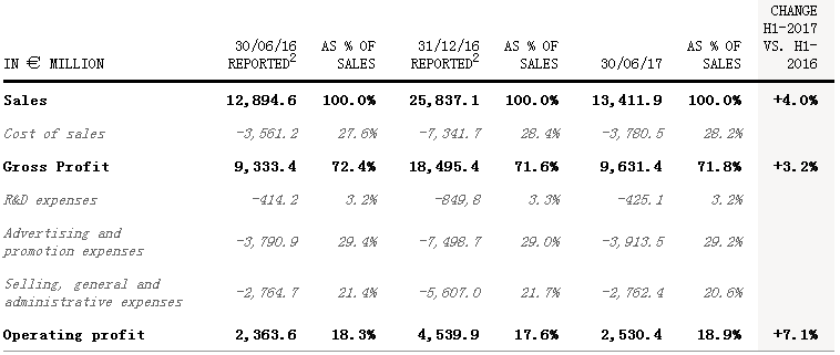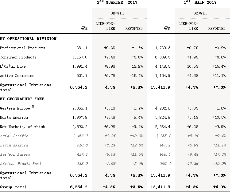 截止 6月30日,欧莱雅集团 2017财年上半年核心财务数据如下: