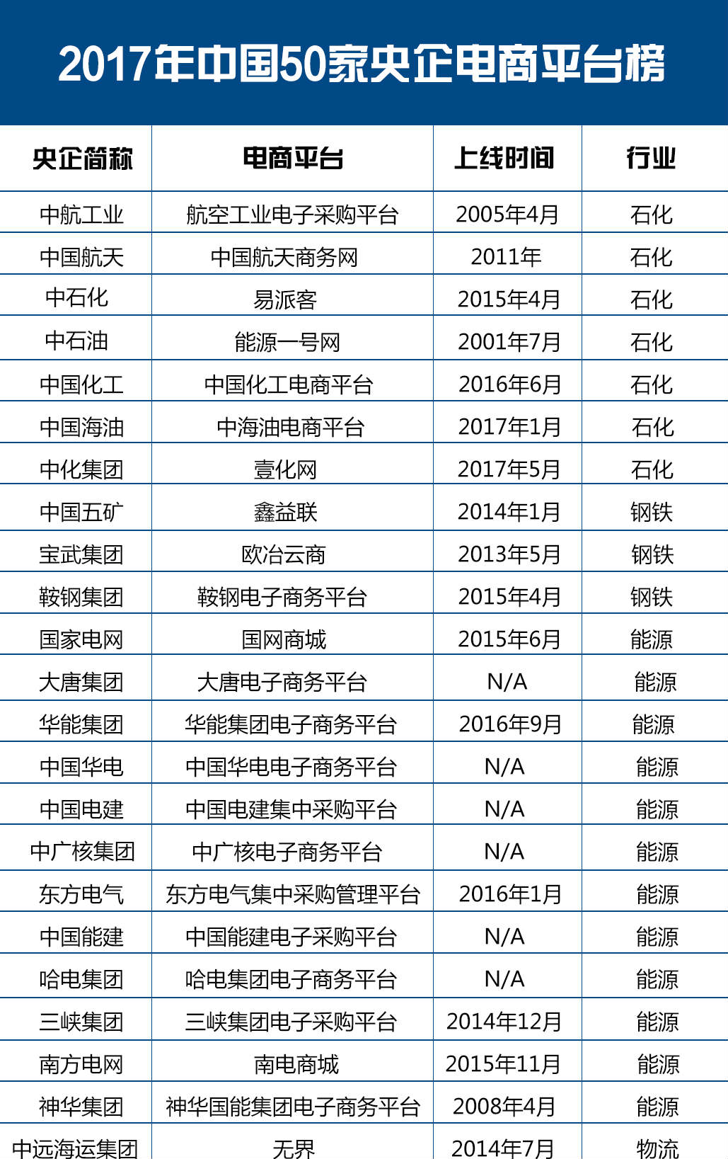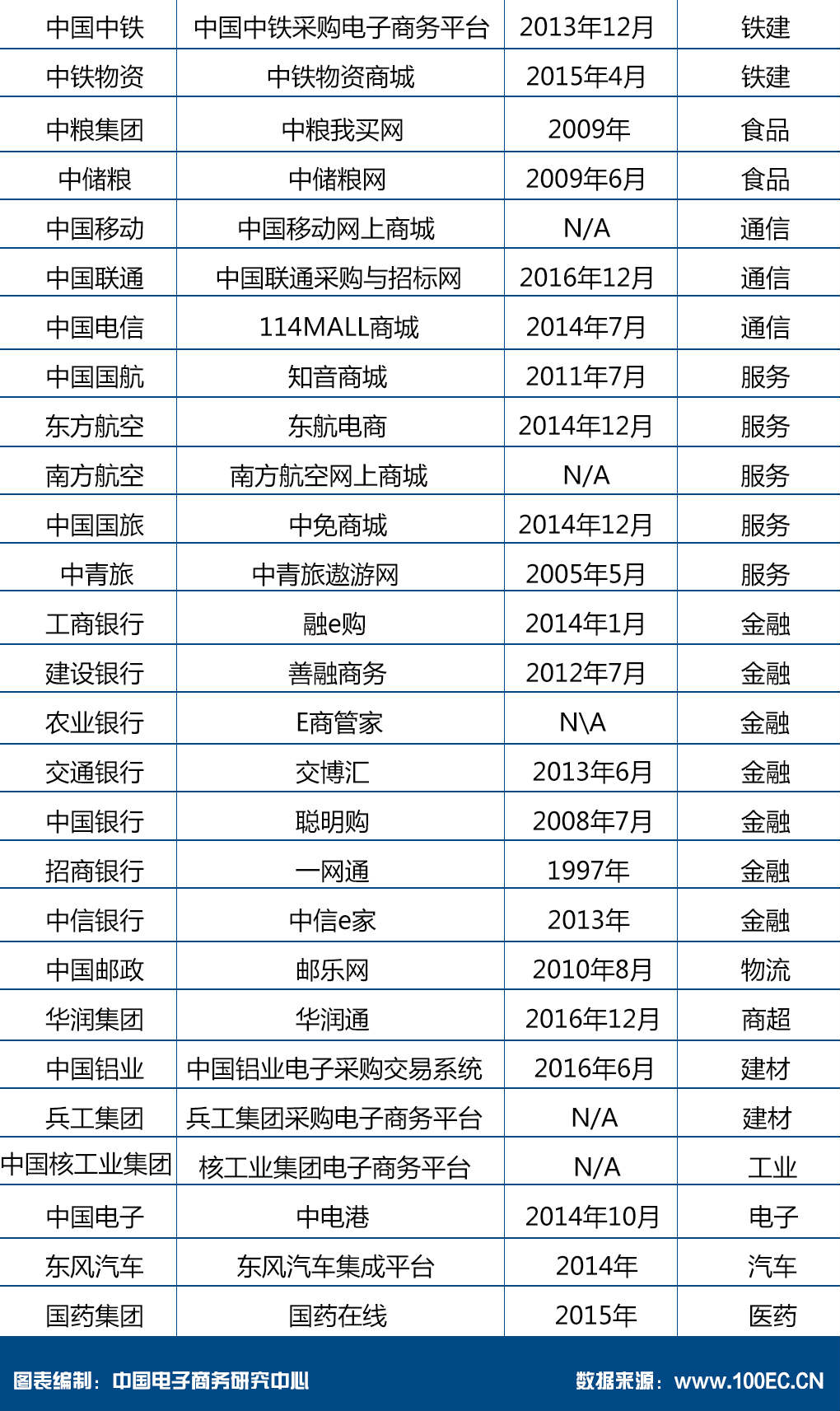 近年来,在互联网浪潮冲击下,央企纷纷主动出击,“+互联网”,推出自己的电商平台。如中粮集团2009年推出“中粮我买网”、中国邮政2010年推出“邮乐网”、中国航天2011年推出“中国航天商务网”、建设银行2012年推出“善融商务”、宝武集团2013年推出“欧冶云商”、中国国旅2014年推出“中免商城”、国药集团2015年推出“国药在线”、中国化工2016年推出“中国化工电商平台”等。