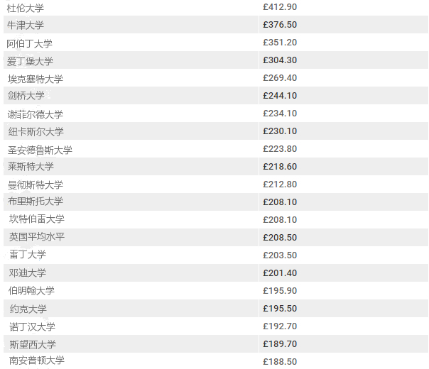数据显示,杜伦大学的学生受父母资助最多,他们平均每月从父母那儿拿到的生活费高达412.90英镑。作为全英最顶尖的大学之一,杜伦大学在英国乃至全世界都一直享有极高的美誉。《泰晤士报》曾这样评价它:“长久以来,作为牛津大学和剑桥大学之外最好的选择,杜伦大学吸引了大量来自中产阶级和更富有家庭的学生。”因此可以看出,杜伦大学学生的消费水平高也是情理之中。牛津大学位列第二名,学生平均每月的生活费达376.50英镑。而作为牛津大学的竞争对手,剑桥大学在这个方面似乎更值得夸赞自己,因为它的学生平均每月从父母那儿拿到的生活费要比牛津大学少100英镑,因此他们就可以声称自己并没有那么奢侈。阿伯丁大学竟然位列榜单的第三名,学生花费达351.20英镑。总而言之,榜单前几名的大学生的生活费均高于英国学生的平均水平,即205.20英镑。