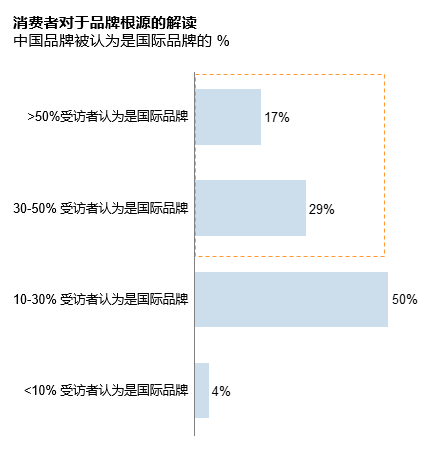 为了让品牌显得更“高端”,很多中国品牌经常会给自己起一个外国名字作掩饰。这种策略尽管看起来有点好笑,但确实在某种程度上起到了作用。在我们调查的52个中国品牌中,接近一半的品牌被超过30%的受访者误认为是国际品牌。