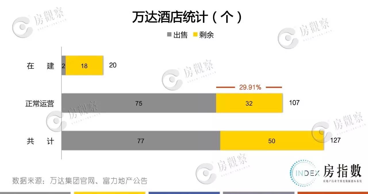 从数量上看,万达商业原有酒店127个,其中正常运营的有107个,项目在建的有20个;此次售出的77个酒店中2个为在建状态,其余75个为正常运营状态;交易之后,万达留有32个正常运营的酒店,不足原有正常运营酒店总数的1/3。