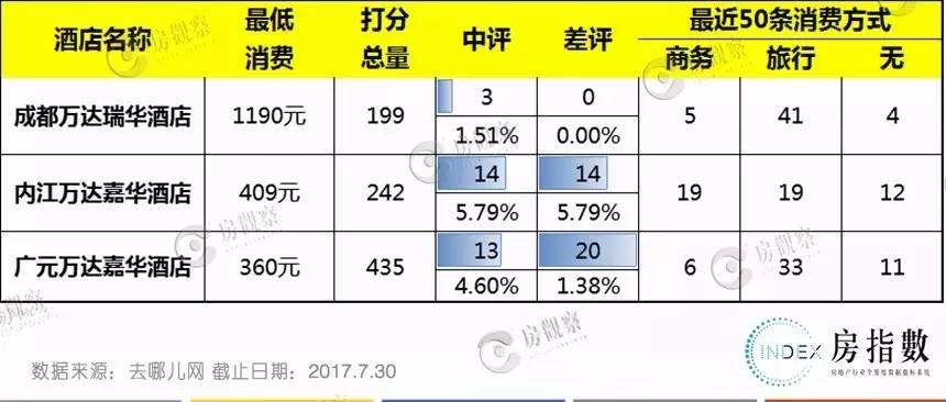 从旅游网站的消费情况来看,在消费水平差距近3倍的情况下,成都万达瑞华酒店的消费频次与内江万达嘉华酒店相近,广元万达嘉华酒店频次最高但价格也最低;另外,2个嘉华酒店的差评比例接近,平均高于瑞华酒店约3%。