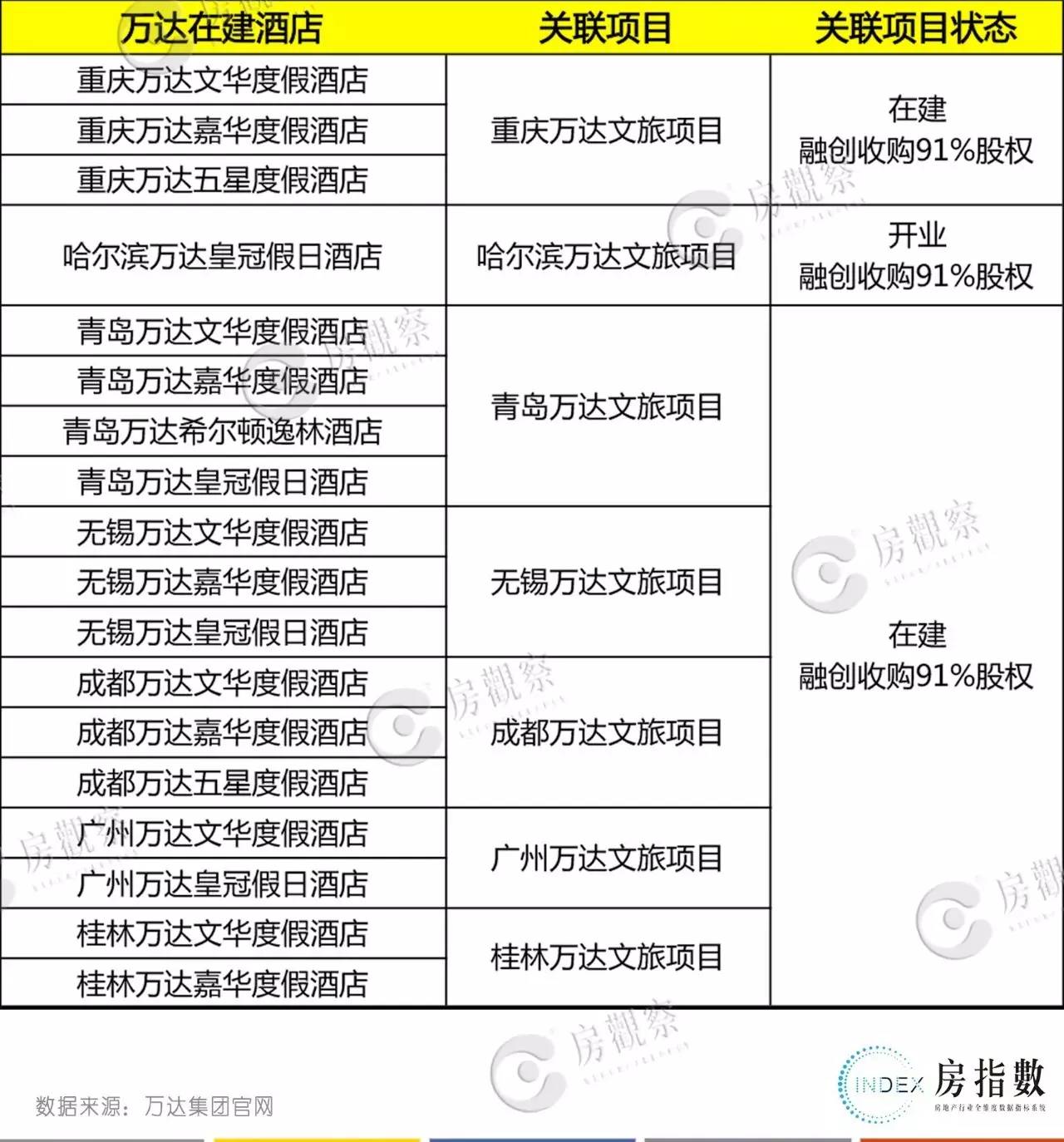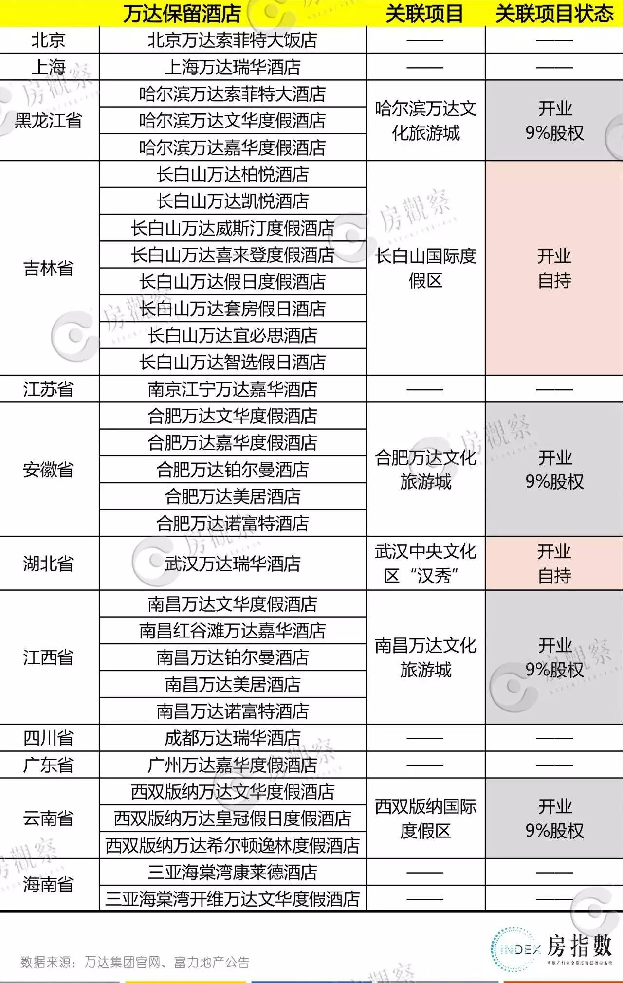 不过,万达在建的酒店中,除2家出售给富力地产外,其余18家基本都是万达文化旅游城项目中的配套度假酒店,而13个万达文化旅游城项目均已将91%股权出售给融创中国,目前万达留在手里的32个酒店项目均为正常运营状态。