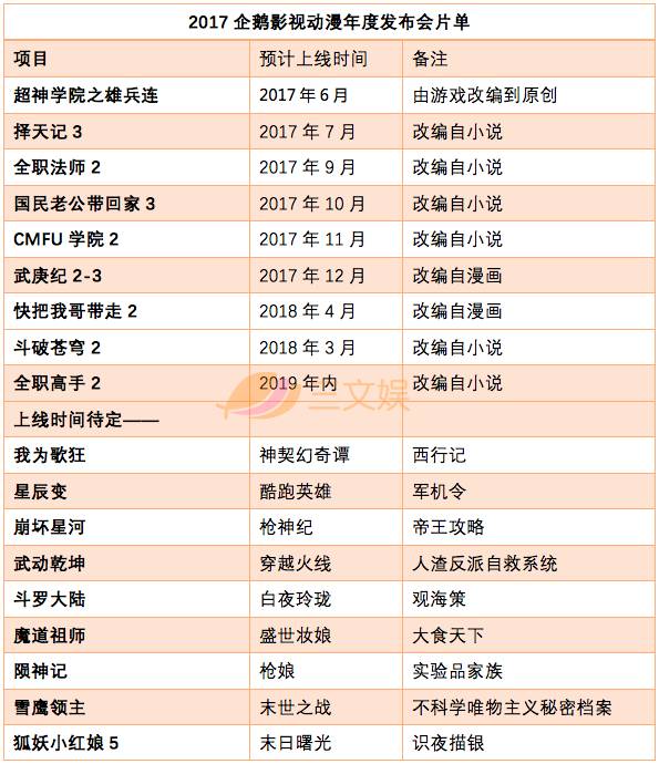 在阅文的片单,我们既看到《星辰变》《武动乾坤》《崩坏星河》等作品动画化启动;也看到《全职高手》《斗破苍穹》《全职法师》《择天记》等大热作品推出续作;还有在目前国内动画制作产能跟不上、团队不稳定的情况下,推出S级IP的动画特别篇,接续第一季动画的完结,在动画番剧断档期继续维系人气。