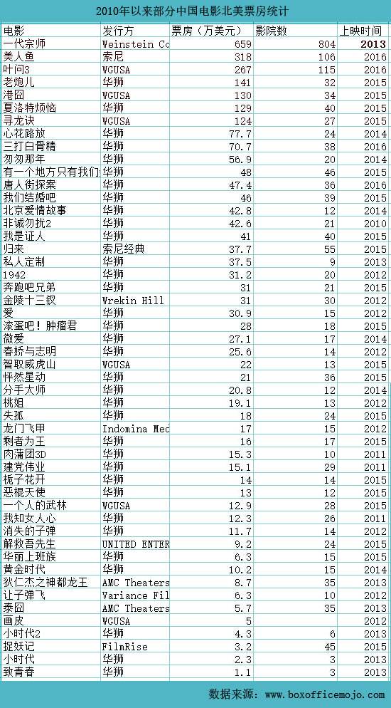 对比几部在北美发行取得高票的华语电影可以看出,导演知名度、主演阵容以及北美发行方都是最大的关键。例如《英雄》和《一代宗师》,其导演张艺谋和王家卫是华语电影在海外最知名的两大导演,片中的李连杰、章子怡、巩俐等明星也在好莱坞闯荡多年。