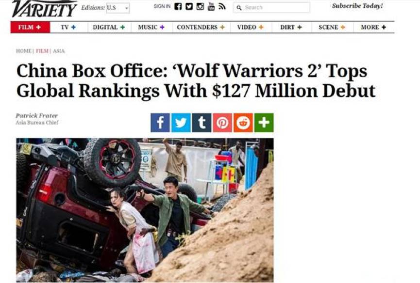 美国娱乐媒体《综艺》昨日就发布了一则题为“中国票房:‘战狼2’以1.27亿美元登上全球票房冠军宝座”文章。其中写道,中国电影《战狼2》以1.27亿美元,力压美国华纳兄弟影片公司发行的二战题材影片《敦刻尔克》的7300万成为上周末全球票房冠军。