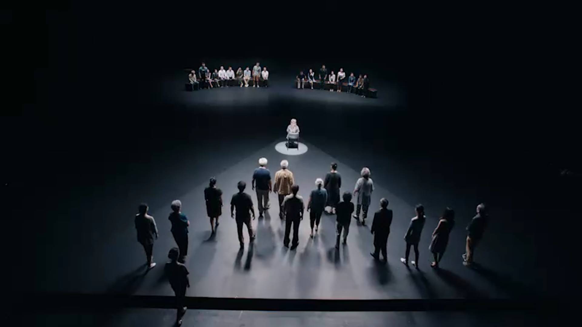 开场,镁光灯亮起,一群观众依次坐在长椅上,从他们的年龄和着装上看,应该就是很普通的用户。