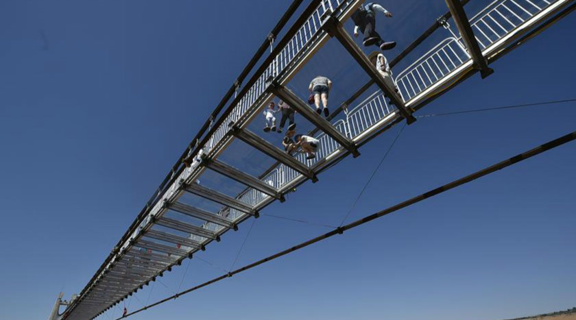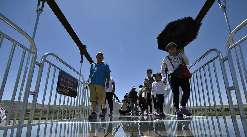 8月2日,游客在黄河3D玻璃桥上小心行走。