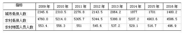 最低生活保障。截至2016年底,全国有城市低保对象855.3万户、1480.2万人。全年各级财政共支出城市低保资金687.9亿元。2016年全国城市低保平均标准494.6元/人·月,比上年增长9.6%。全国有农村低保对象2635.3万户、4586.5万人。全年各级财政共支出农村低保资金1014.5亿元。2016年全国农村低保平均标准3744.0元/人·年,比上年增长17.8%。