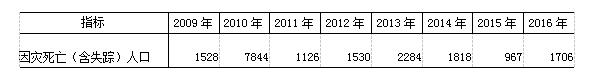 5.防灾减灾救灾。2016年全国各类自然灾害共造成1.9亿人次不同程度受灾,因灾死亡失踪1706人,紧急转移安置910.1万人次;农作物受灾面积26220.7千公顷,其中绝收面积2902.2千公顷;倒塌房屋52.1万间,损坏房屋334.0万间;因灾直接经济损失5032.9亿元。国家减灾委、民政部共启动国家救灾应急响应22次,向各受灾省份累计下拨中央自然灾害生活补助资金79.1亿元(含中央冬春救灾资金57.1亿元),紧急调拨4.1万顶救灾帐篷、15万床棉被、1.6万件棉大衣、2.5万个睡袋、2.3万张折叠床等生活类中央救灾物资。