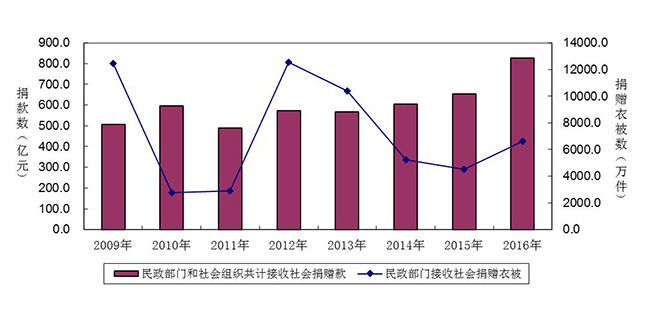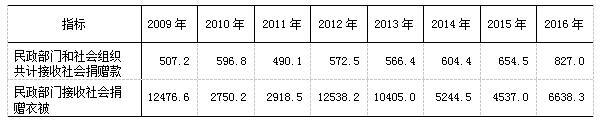 慈善捐赠。截至2016年底,全国共建立经常性社会捐助工作站、点和慈善超市2.9万个(其中:慈善超市8966个)。全年共接收社会捐赠款827.0亿元,比上年增长26.4%,其中:民政部门直接接收社会各界捐款40.3亿元,各类社会组织接收捐款786.7亿元。全年各地民政部门直接接收捐赠物资价值折合人民币7.4亿元,捐赠衣被6638.3万件。间接接收其他部门转入的捐赠物资折款1.4亿元,社会捐款5.9亿元,衣被488.0万件。全年有1165.8万人次困难群众受益。全年有931.0万人次在社会服务领域提供了2522.6万小时的志愿服务。