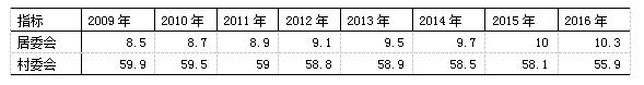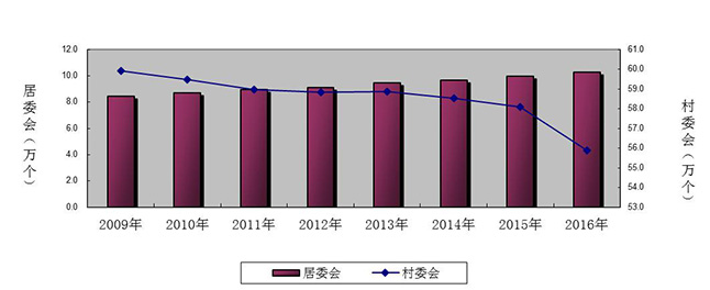 2.自治组织。截至2016年底,基层群众自治组织共计66.2万个。其中:村委会55.9万个,比上年下降3.8%,村民小组447.8万个,村委会成员225.3万人,比上年下降1.9%;居委会10.3万个,比上年增长3.3%,居民小组142.0万个,居委会成员54.0万人,比上年增长5.4%。全年共有9.7万个村(居)委会完成选举,参与选举的村(居)民登记数为1.7亿人,参与投票人数为0.9亿人。
