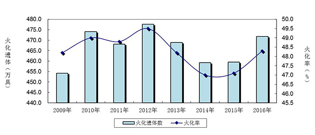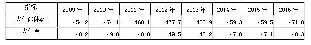 2.殡葬服务。截至2016年底,全国共有殡葬服务机构4166个,其中殡仪馆1775个,殡葬管理机构1005个,民政部门管理的公墓1386个。殡葬服务机构职工8.1万人,其中殡仪馆职工4.7万人。火化炉6206台,火化遗体471.8万具,火化率48.3%,比上年增加1.2个百分点。