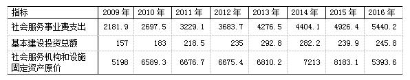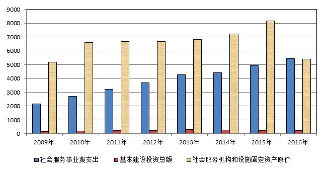 截至2016年底,全国共有社会服务机构和设施174.5万个,职工总数1239.3万人,固定资产原价5393.6亿元;社会服务事业基本建设在建项目建设规模3050.9万平方米,全年实际完成投资总额245.8亿元;全国持证社会工作者共计28.8万人,其中社会工作师6.9万人,助理工作师21.9万人;全国社会服务事业费支出5440.2亿元,比上年增长10.4%,占国家财政支出比重为3.4%,其中中央财政向各地转移支付社会服务事业费2484.0亿元,比上年增长9.4%,占社会服务事业费比重为45.7%,同比下降0.4个百分点。