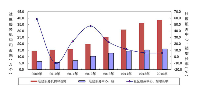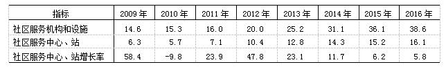 8.社区服务。截至2016年底,全国共有各类社区服务机构和设施38.6万个,其中社区服务指导中心809个(其中农村27个),社区服务中心2.3万个(其中农村0.8万个),社区服务站13.8万个(其中农村7.2万个),社区养老服务机构和设施3.5万个,比上年增长34.6%,互助型养老服务设施7.6万个,比上年增长22.6%,其他社区服务设施11.3万个,社区服务中心(站)覆盖率24.4%,其中城市社区服务中心(站)覆盖率79.3%,农村社区服务中心(站)覆盖率14.3%。城镇便民、利民服务网点8.7万个。社区志愿服务组织11.6万个。