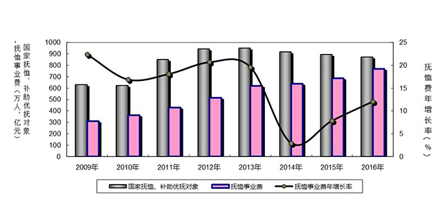 医疗救助。2016年资助参加基本医疗保险5560.4万人,支出资助参加基本医疗保险资金63.4亿元,资助参加基本医疗保险人均补助水平113.9元。2016年实施住院和门诊医疗救助2696.1万人次,支出资金232.7亿元,住院和门诊人次均救助水平分别为 1709.1元和190.0元。 2016年全年累计资助优抚对象409.2万人次,优抚医疗补助资金36.2亿元,人均补助水平885.5元。