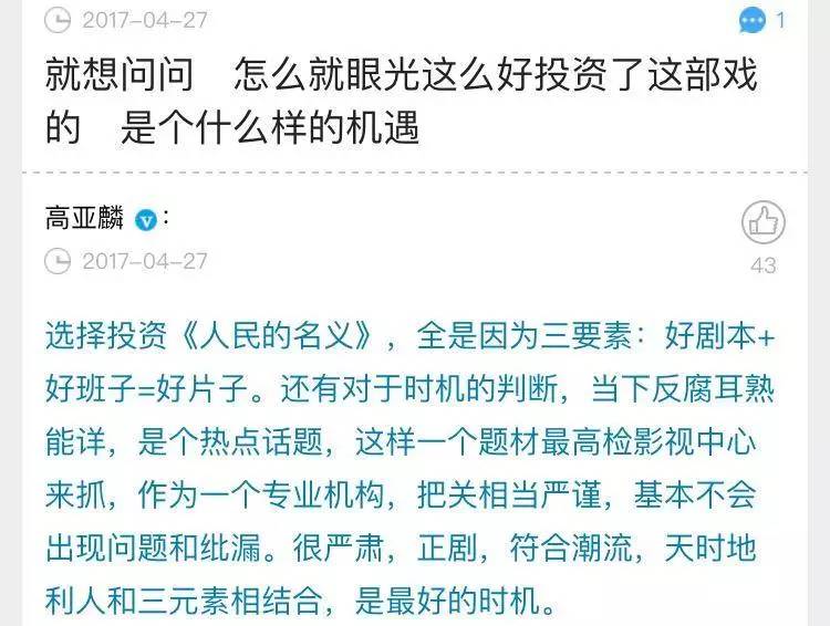 高亚麟谈投资《人民的名义》,虽然题材敏感,但也是时下热点,并且有最高检视中心把关