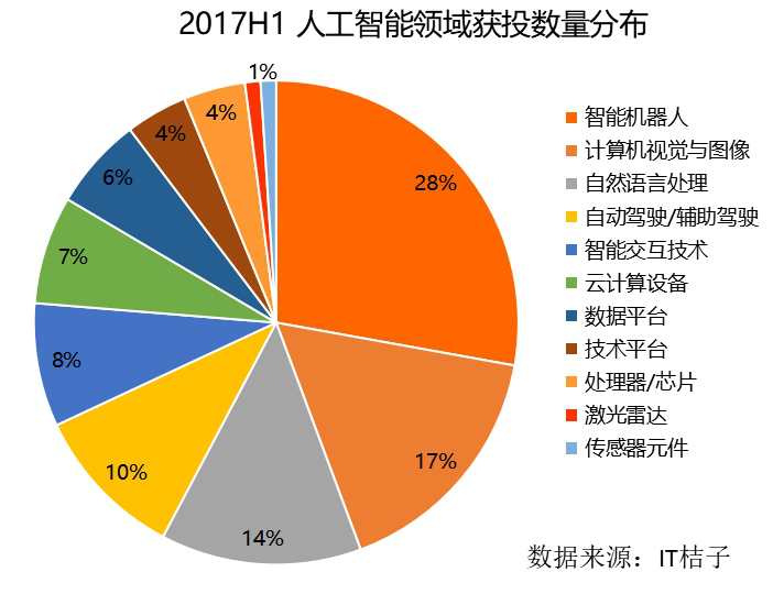 上半年中,今日头条获亿级美元融资,使得「自然语言处理」一举成为融资金额最高的子领域;「智能机器人」持续受追捧,融资数量最多,约占总融资事件的28%。
