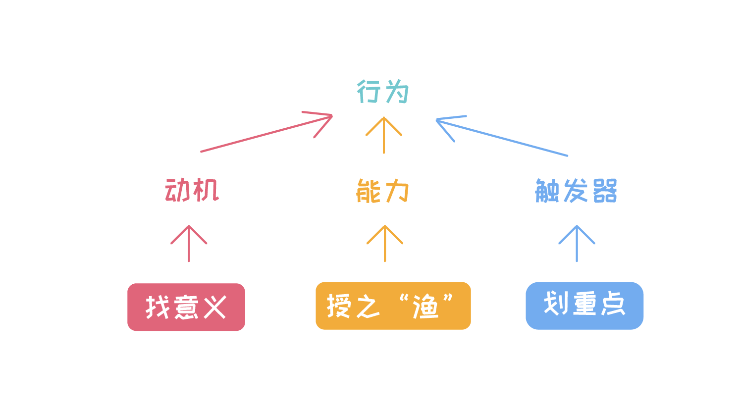也就是说,只有当一个人有足够的动机,并且有能力去做到,而且有触发器来提醒的时候,一个行为才最终可能发生。