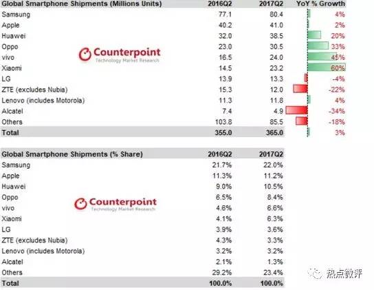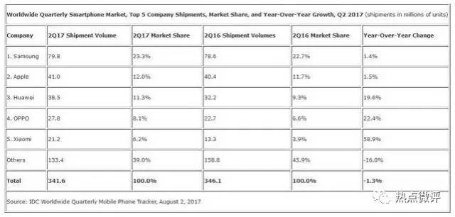 日前IDC发布了Q2全球智能手机出货量数据报告,数据显示,2017年Q2三星智能手机出货量为7980万部,市场份额为23.3%,位居第一。苹果iPhone出货量为4100万部,市场份额为12%,排名第二。华为、OPPO、小米分列第三、第四、第五,华为出货量为3850万部,市场份额为11.3%,出货量与苹果之间只有250万部的差距;OPPO出货量为2780万部,市场份额为8.1%;小米出货量为2120万部,市场份额为6.2%。
