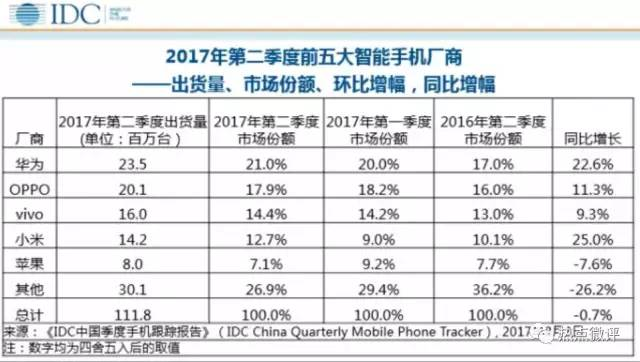 国内智能手机市场,国产手机华米欧维的格局大致上没有大的变动,从中国本土市场来看,根据IDC最新发布的手机季度跟踪报告显示,2017年第二季度,中国智能手机市场出货量同比下降0.4%,华为智能手机出货量排名第一,同比增长约22.6%。OPPO、vivo分别位居第二、第三,出货量同比增长分别约为11.3%和9.3%。小米排名第四,市场份额占比为12.7%,同比增长25%。