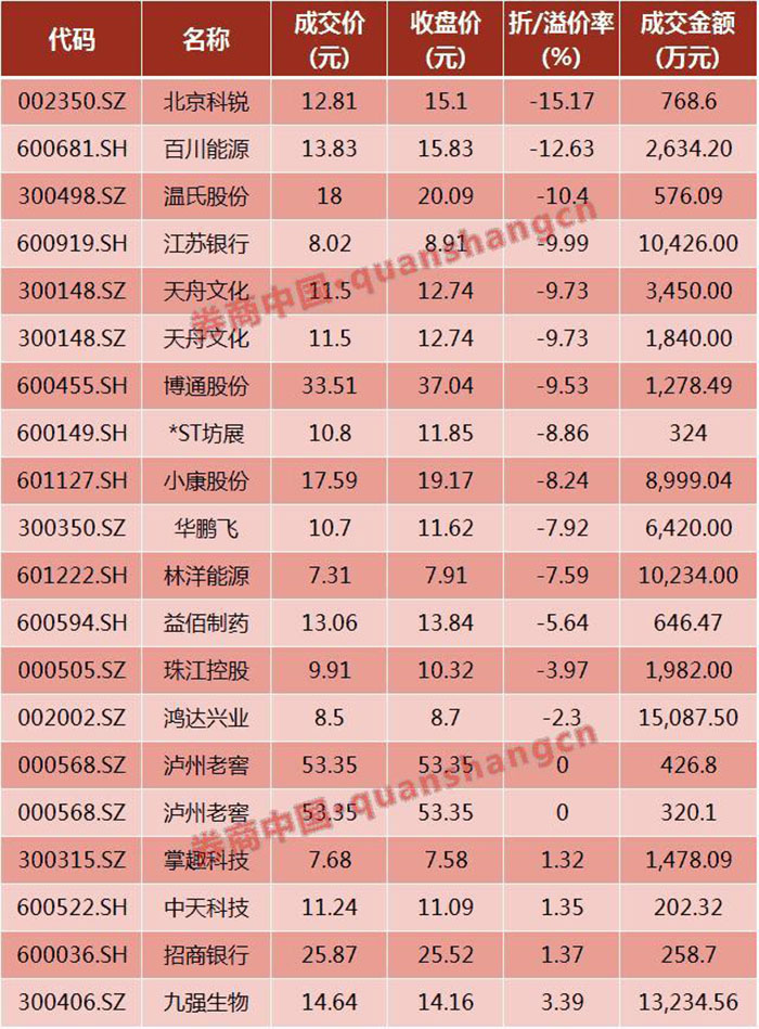 两市合计有招商银行、江苏银行、温氏股份、泸州老窖等18只个股出现大宗交易,多只个股出现大幅折价成交的情况。其中,温氏股份、北京科锐、天舟文化、华鹏飞、林洋能源、江苏银行、百川能源、博通股份等多达8只个股均以当日跌停价成交。折价方面,北京科锐的折价率最高,为15.17%,百川能源、温氏股份折价率也超过了10%。